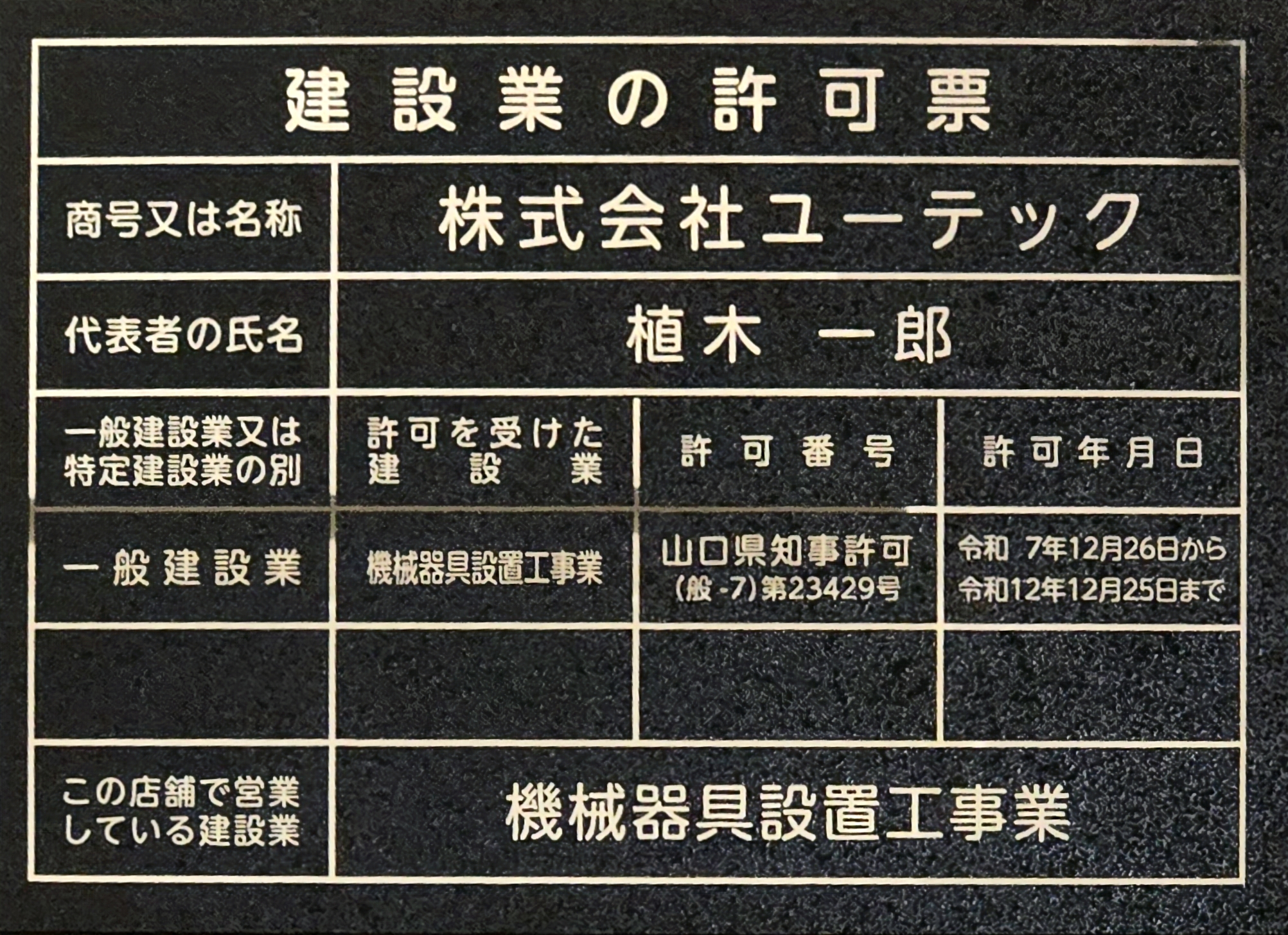 このたび株式会社ユーテックは、建設業許可(機械器具設置工事業)山口県知事許可(般-7)第23429号 を取得いたしました。